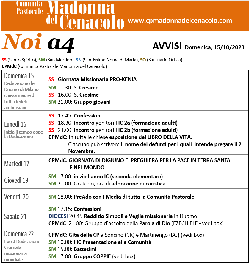 Nuovo a4: Avvisi della CP del 15/10/2023 Postato il 13 ottobre 202313 ottobre 2023 di cpmadonnadelcenacolo PER LEGGERE IN NOI 15 di questa settimana potete andare sul link: NOI 15 del 15-10-2023 Condividi: Fai clic per inviare un link a un amico via e-mail (Si apre in una nuova finestra) E-mail Fai clic per condividere su WhatsApp (Si apre in una nuova finestra) WhatsApp Fai clic per condividere su Facebook (Si apre in una nuova finestra) Facebook Fai clic per condividere su X (Si apre in una nuova finestra) X Fai clic qui per stampare (Si apre in una nuova finestra) Stampa Correlati