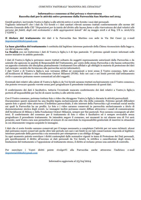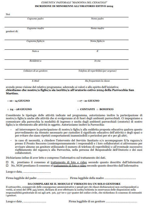 Il volantino di presentazione e sotto i moduli da poter scaricare per iscrivere i bambini all’oratorio estivo 2024 (cliccare sui titoli o sulle immagini)