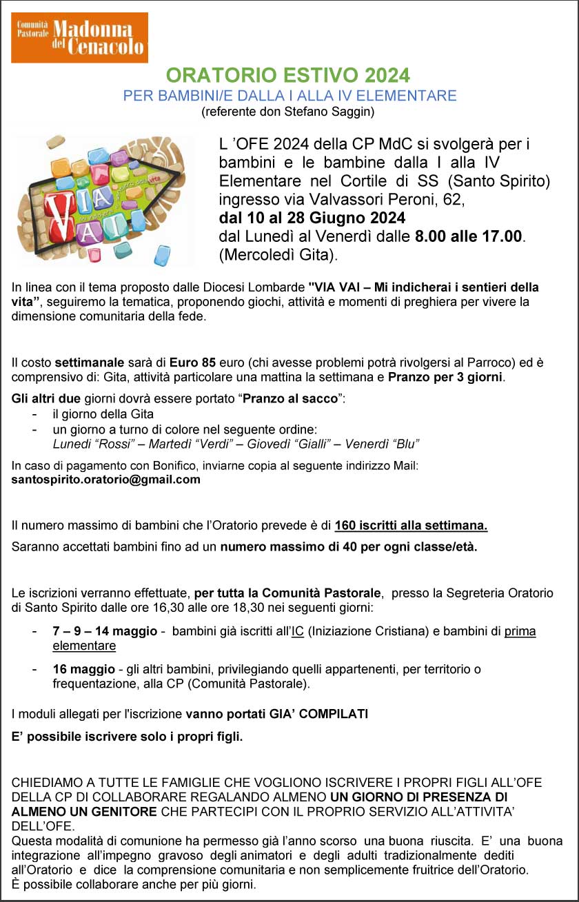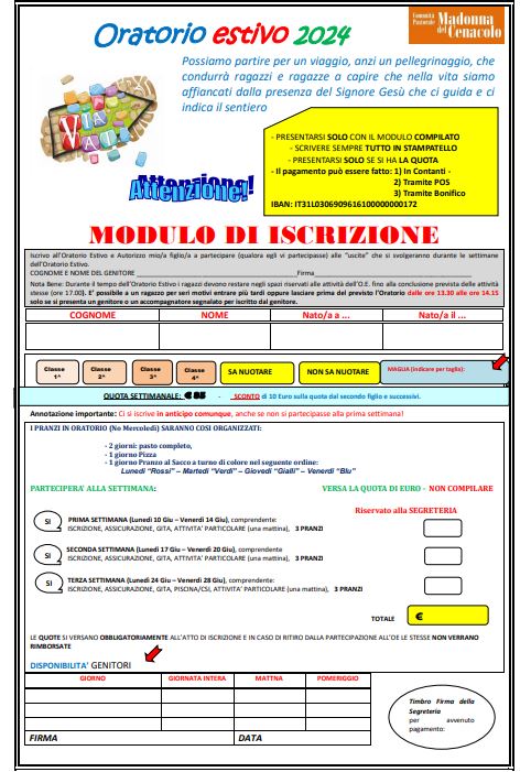 Iscrizioni Oratorio Estivo 2024 dalla 1° alla 4° elementare Postato il 23 aprile 20242 Maggio 2024 di cpmadonnadelcenacolo Il volantino di presentazione e sotto i moduli da poter scaricare per iscrivere i bambini all’oratorio estivo 2024 (cliccare sui titoli o sulle immagini) VOLANTINO ORATORIO ESTIVO 2024 – clicca per scaricare MODULO ISCRIZIONI 1 – 2024 – clicca per scaricare MODULO ISCRIZIONI 2 – 2024 – clicca per scaricare PRIVACY – clicca per scaricare Condividi: Fai clic per inviare un link a un amico via e-mail (Si apre in una nuova finestra) E-mail Fai clic per condividere su WhatsApp (Si apre in una nuova finestra) WhatsApp Fai clic per condividere su Facebook (Si apre in una nuova finestra) Facebook Fai clic per condividere su X (Si apre in una nuova finestra) X Fai clic qui per stampare (Si apre in una nuova finestra) Stampa Correlati