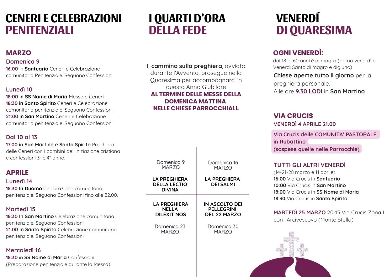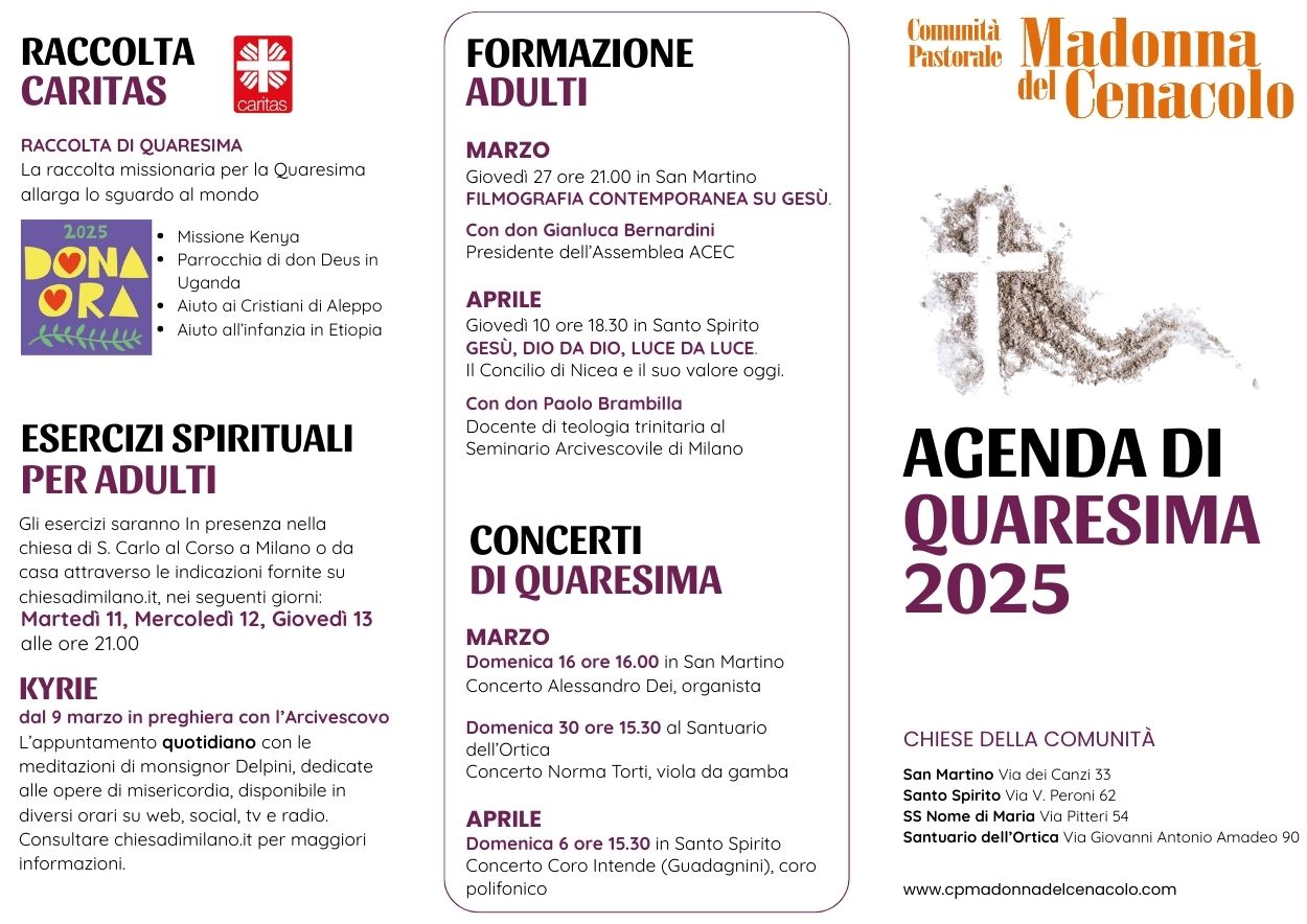 QUARESIMA 2025: calendario, preghiera e iniziative carità Postato il 27 febbraio 20257 aprile 2025 di cpmadonnadelcenacolo I QUARTO D’ORA DELLA FEDE per la Quaresima 2025. Esercizi spirituali di Quaresima 2025 con Padre Ermes Ronchi. RIASCOLTABILI su youtube. Scarica il pieghevole con tutte le date e le informazioni: SE VUOI SCARICA IL PDF: QUARESIMA 2025 3 ANTEDownload Condividi: Fai clic per inviare un link a un amico via e-mail (Si apre in una nuova finestra) E-mail Fai clic per condividere su WhatsApp (Si apre in una nuova finestra) WhatsApp Fai clic per condividere su Facebook (Si apre in una nuova finestra) Facebook Fai clic per condividere su X (Si apre in una nuova finestra) X Fai clic qui per stampare (Si apre in una nuova finestra) Stampa Correlati