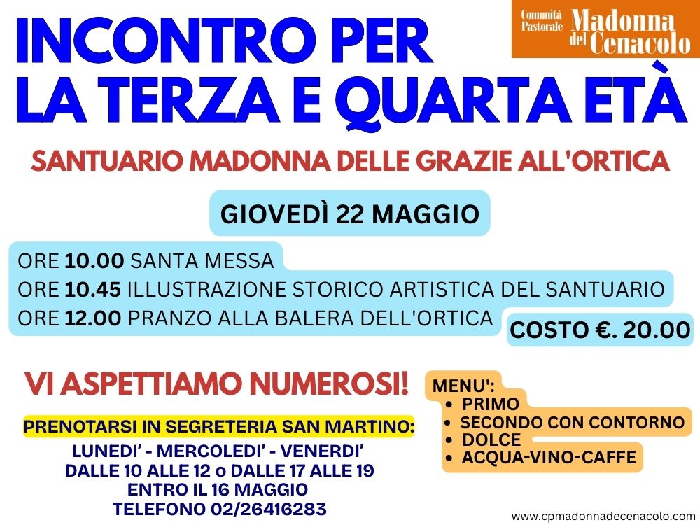 Incontro per la TERZA e QUARTA età il 22 MAGGIO al Santuario dell’Ortica