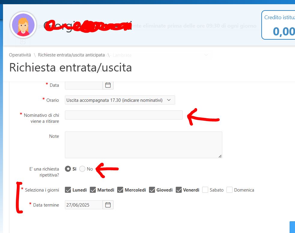 - Indicare nel campo Nominativo la/e persona/e che potranno prendere il bambino oppure scrivere nel campo “autorizzato a uscire da solo”.