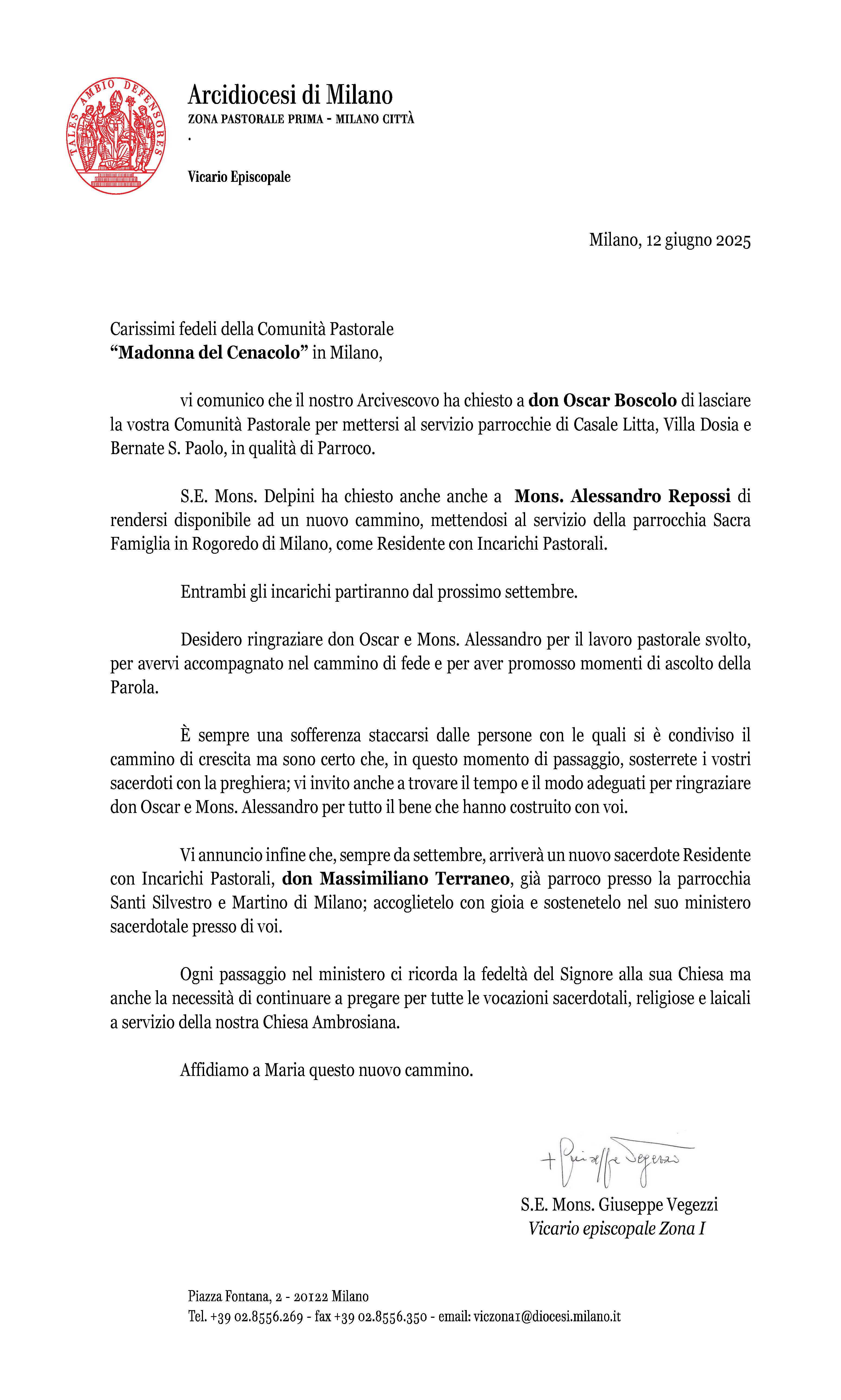 Il Vicario episcopale della città di Milano (Zona 1) ha mandato alla nostra CP notizia di alcune variazioni nella composizione del clero a servizio delle nostre parrocchie. Avremo modo di salutare e ringraziare ufficialmente chi parte e di accogliere chi arriva. Possiamo da subito però farci vicini ai preti che cambiano destinazione.