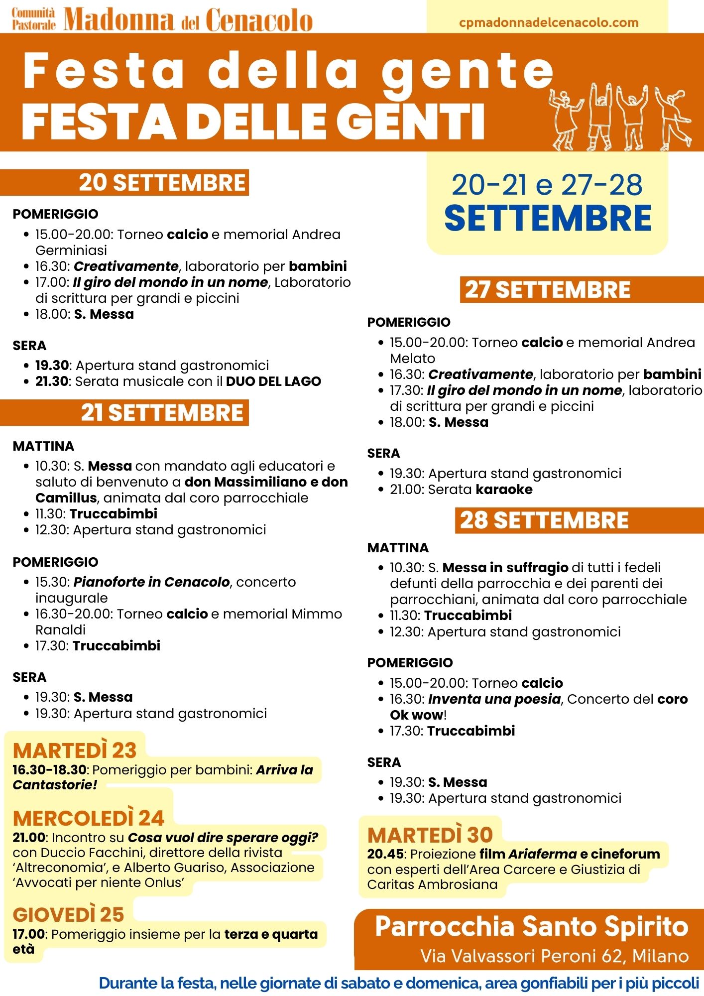 FESTA DELLA GENTE, FESTA DELLE GENTI 2025 in SANTO SPIRITO con anche gli eventi nella settimana Postato il 10 settembre 202520 settembre 2025 di cpmadonnadelcenacolo Festa delle gente, festa delle genti …per i bambini Pianoforte in Cenacolo, concerto con i giovani musicisti della comunità pastorale e Alessandro Dei “Cosa vuol dire sperare oggi?”: il 24/09 incontro e 30/09 cineforum con proiezioni “Ariaferma” POMERIGGIO INSIEME PER LA TERZA E QUARTA ETA’ IL 25 SETTEMBRE Condividi: Fai clic per inviare un link a un amico via e-mail (Si apre in una nuova finestra) E-mail Fai clic per condividere su WhatsApp (Si apre in una nuova finestra) WhatsApp Fai clic per condividere su Facebook (Si apre in una nuova finestra) Facebook Fai clic per condividere su X (Si apre in una nuova finestra) X Fai clic qui per stampare (Si apre in una nuova finestra) Stampa Correlati