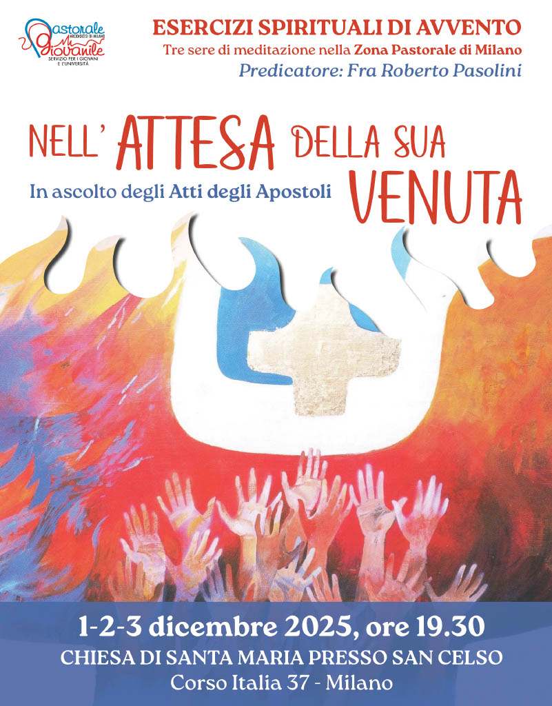 Giovani: Esercizi Spirituali d’Avvento, 1-2-3 dicembre 2025 alle 19.30 in San Celso, Fra Roberto Pasolini Postato il 24 novembre 202524 novembre 2025 di cpmadonnadelcenacolo Condividi: Invia un link a un amico via e-mail (Si apre in una nuova finestra) E-mail Condividi su WhatsApp (Si apre in una nuova finestra) WhatsApp Tweet Stampa (Si apre in una nuova finestra) Stampa Mi piace Caricamento... Correlati
