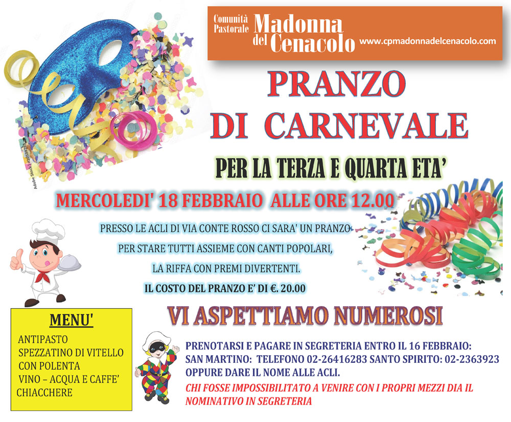 PRANZO DI CARNEVALE per la terza e quarta età il 18 febbraio 2026 Postato il 29 gennaio 202629 gennaio 2026 di ariannacantoni83 Condividi: Invia un link a un amico via e-mail (Si apre in una nuova finestra) E-mail Condividi su WhatsApp (Si apre in una nuova finestra) WhatsApp Condividi su Facebook (Si apre in una nuova finestra) Facebook Condividi su X (Si apre in una nuova finestra) X Stampa (Si apre in una nuova finestra) Stampa Correlati