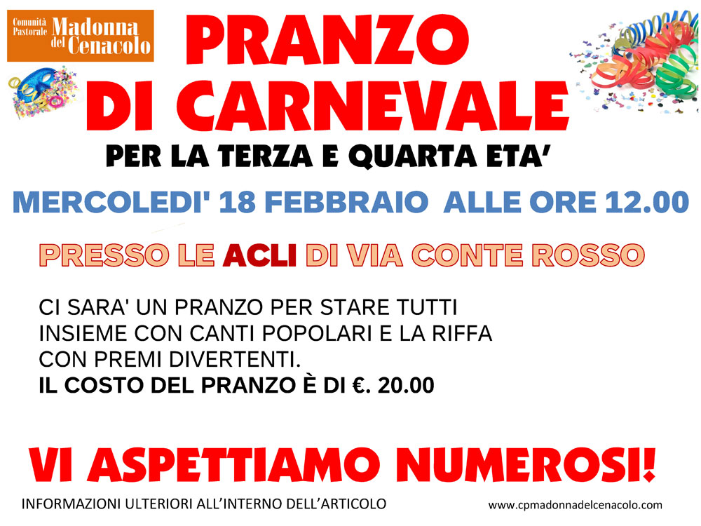 Appuntamenti e avvisi alla Comunità Pastorale – dal 01/02/2026 Postato il 31 gennaio 202631 gennaio 2026 di cpmadonnadelcenacolo CONSULTA IL NOTIZIARIO degli avvisi settimanali “Noi a4” in formato PDF_ L’AMORE POSSIBILE. Conoscere ed incontrare: le strade per affrontare la questione gender. INCONTRI 29/01 e 05/2. Link con materiale bibliografico e filmografico._ Notiziario Settimanale con anche rendicontazione offerte 2026_ UNZIONE DEGLI INFERMI: appuntamenti per l’1 e l’8 gennaio_ VENDITA PRIMULE 7 E 8 FEBBRAIO_ PRANZO DI CARNEVALE per la terza e quarta età il 18 febbraio 2026_ VACANZE PREADO estate 2026: tutte le info_ VACANZE ELEMENTARI estate 2026: info e date_ I giovedì dell’ADORAZIONE EUCARISTICA fino al 19/02_ ANNIVERSARI DI MATRIMONIO in San Martino il 15/02 e consegna attestati corso pre-matrimoniale_ CERCASI VOLONTARI PER L’ANIMAZIONE DELLA MESSA AL POLO GERIATRICO RIABILITATIVO_ PROGETTO PASTORALE della Comunità Pastorale Madonna del Cenacolo VAI ALL’HOME PAGE DEL SITO Condividi: Invia un link a un amico via e-mail (Si apre in una nuova finestra) E-mail Condividi su WhatsApp (Si apre in una nuova finestra) WhatsApp Tweet Stampa (Si apre in una nuova finestra) Stampa Mi piace Caricamento... Correlati