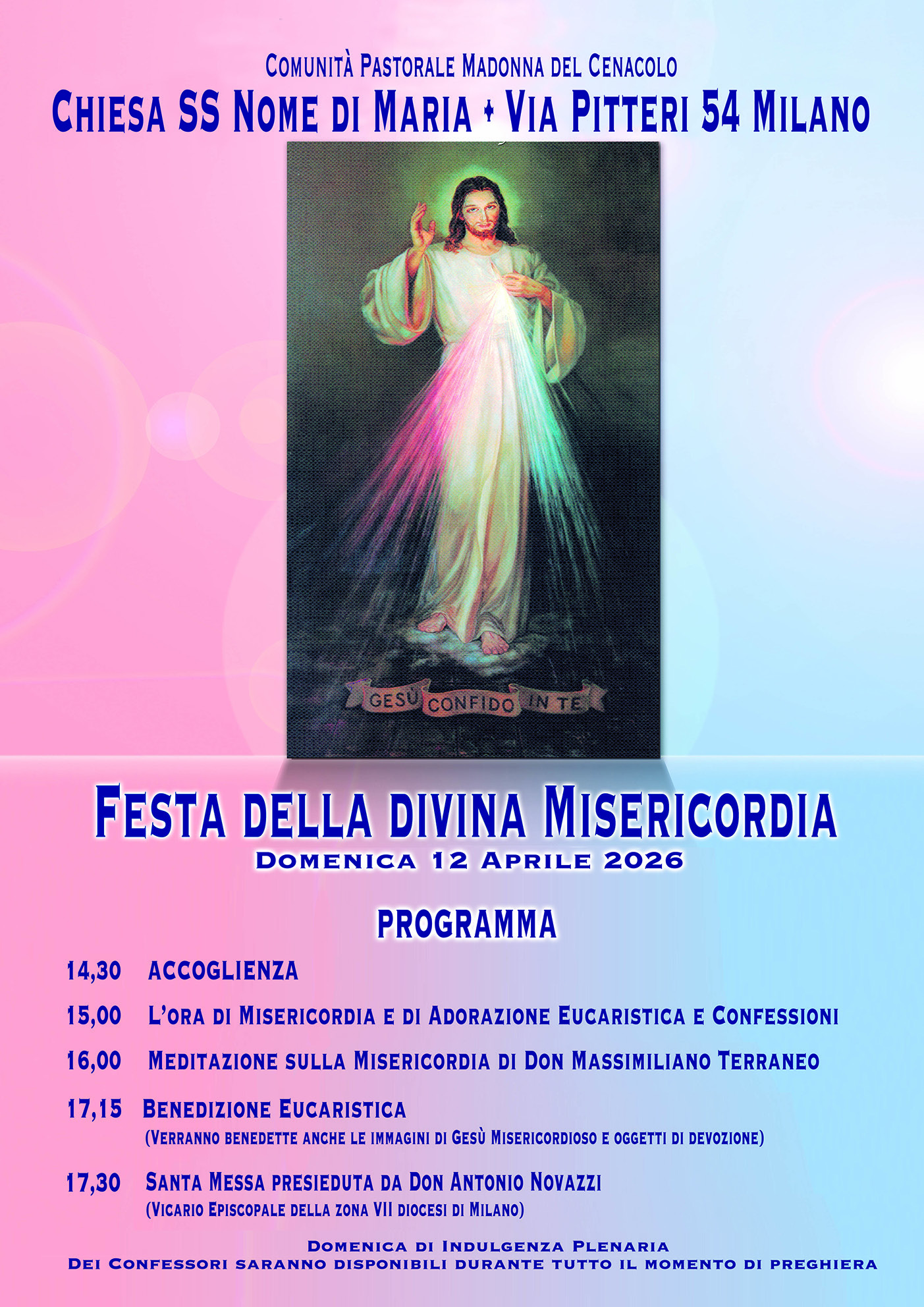 Mi permetto di aggiungere un’esperienza personale: da quando nella chiesa di SS. Nome di Maria è stato appeso il quadro della Divina Misericordia, mi piace soffermarmi qui per più tempo che posso perché guardare il volto di Cristo, che sembra ricambiare il mio sguardo, e le sue braccia aperte e i raggi che Gli escono dal Cuore, sono delle cose che aiutano molto la mia preghiera e spesso mi riempiono di commozione e di pensieri belli. Ogni volta che me ne vado via porto con me un gran senso di pace come poche altre esperienze mi danno.