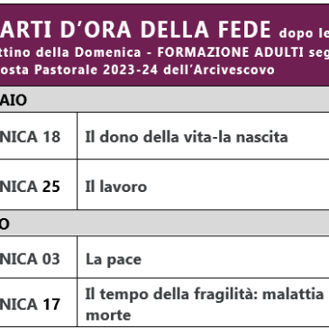 Torna alla sezione FORMAZIONE, CONVEGNI AUDIO di Domenica 18/02 – Il dono della vita-la nascita: AUDIO di Domenica 25/02 – Il lavoro: AUDIO di Domenica 03/03 – La pace: AUDIO di Domenica 17/03 – Il tempo della fragilità: malattia e morte:
