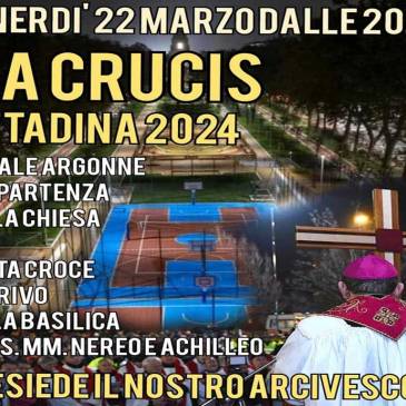 Venerdì 22 marzo, dalle ore 20:45 percorreremo la Via Crucis cittadina in viale Argonne,con partenza dalla nostra chiesa di Santa Crocee conclusione nella basilica dei Santi Martiri Nereo e Achilleo. Presiede l’Arcivescovo. E’ possibile scaricare il sussidio per la celebrazione comunitaria della Via Crucis cliccando sull’immagine a fianco o sul tasto download. PERCORSO
