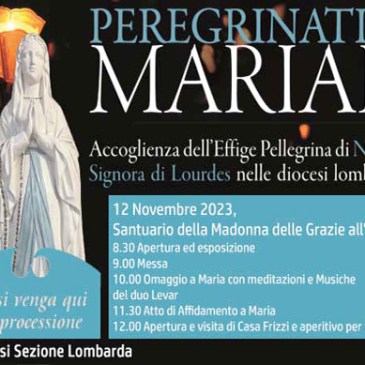 Al termine di un anno che ha visto celebrare i 120 anni dell’UNITALSI, il Santuario di Lourdes ci ha affidato l’effige pellegrina di Nostra Signora di Lourdes, che viene utilizzata periodicamente per la processione aux flambeaux, una delle espressioni più emozionanti del pellegrinaggio.Maria ci invita a “metterci in processione” con Lei permettendo di incontrarla anche … More Accoglienza Effige pellegrina di NOSTRA SIGNORA DI LOURDES al Santuario dell’Ortica 12/11 ore 9.00