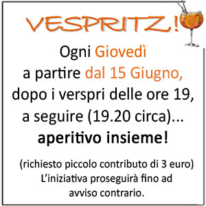 L’ultimo appuntamento di quest’estate sarà il 20 luglio. Ogni Giovedì, alla Parrocchia di Santo Spirito, a partire dal 15 giugno, dopo i Vespri delle 19.00, alle 19.20 circa, rimarremo insieme con uno… Spritz! E’ richiesto un piccolo contributo di 3 euro per chi voglia partecipare.Venite numerosi!