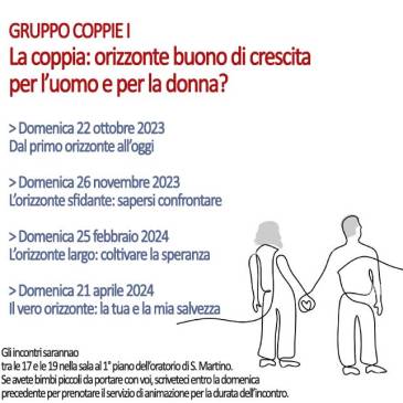 La coppia: orizzonte buono di crescita per l’uomo e per la donna? Il 22 ottobre 2023 inizia il percorso del gruppo coppie. Gli incontri hanno l’obiettivo di offrire un’occasione preziosa per fermarsi e prendersi cura della propria vita di coppia, riflettendo sulle tematiche proposte alla luce della Parola.Il tema scelto per l’anno 2023-2024 è La … More GRUPPO COPPIE in San Martino: domenica 25/02 alle 17, “L’orizzonte largo: coltivare la speranza”
