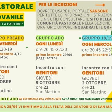 Per iscriversi alle attività dell’oratorio (compreso il catechismo) occorre prima registrarsi al portale Sansone: andate sul seguente link per tutte le informazioni e un manuale informativo per procedere:https://cpmadonnadelcenacolo.com/2025/09/05/sansone-il-nuovo-portale-per-iscriversi-alle-attivita-degli-oratori/. Per i bambini che sono già registrati in Sansone potete procedere all’iscrizione direttamente facendo il login su Sansone, sansone.clsoft.it. Per i bambini già registrati su Sansone che … More Date consegna moduli prima registrazione SANSONE, incontri con i genitori e iscrizioni per l’Iniziazione Cristiana