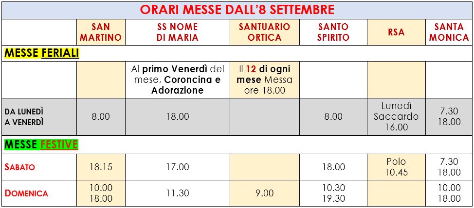 ORARIO SANTE MESSE DALL’8 SETTEMBRE 2025: