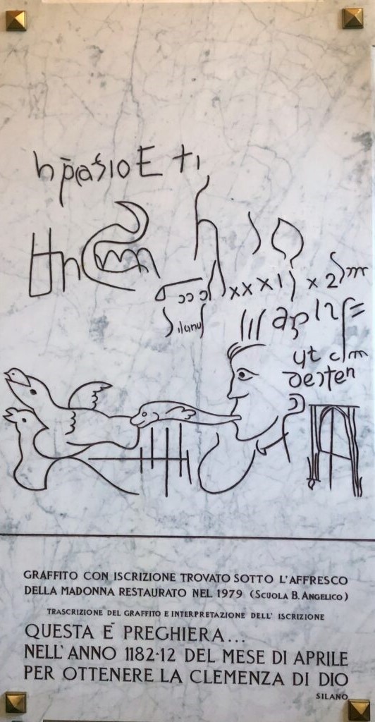 “Questa (immagine) è preghiera, o Signore (il segno di croce), l’anno 1182 il 12 del mese di aprile, per ottenere la clemenza di Dio”. Segue la firma “Silanus”, probabilmente il monaco “scrittore”, o addirittura il pittore autore dell’affresco. Il graffito consta anche di disegni riferiti alle condizioni di vita del luogo: si nota un uomo che tiene in bocca un’anguilla, a significare la pescosità (sic!) del Lambro, anitre selvatiche, il fiume che scende dalla Valassina in Brianza; infine, in basso a destra, il disegno di una porta (senza dubbio la Porta Orientale), che rivela la nostalgia dei milanesi esuli e il loro conseguente anelito di poter presto fare ritorno in città. Infatti, a seguito della distruzione di Milano nel 1162 ad opera di Federico Barbarossa dopo sette mesi di assedio, i milanesi di Porta Orientale vennero esiliati nei borghi circostanti di Lambrate e Cavriana, sul cui confine sorgeva la Cappella stazionaria di S. Faustino. Con la vittoria di Legnano (1176) della Lega Lombarda, rinacque negli esiliati la speranza di poter fare ritorno alla Città ed essi, profondamente religiosi, chiesero alla Madonna tale grazia.